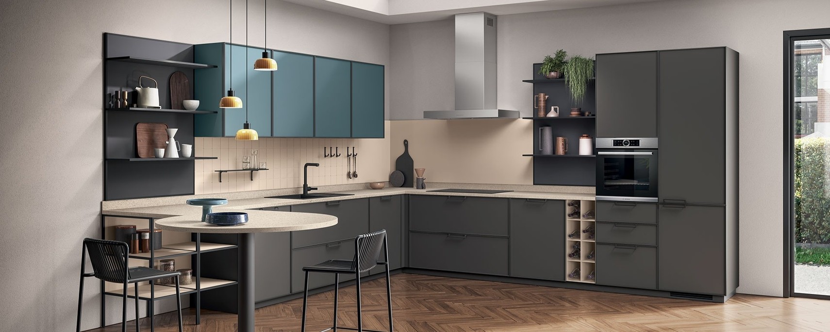 Tra i modelli più attuali spicca la Cucina Jeometrica, nata in collaborazione con Nichetto Studio. La sua anta a telaio da 29 millimetri con profili in alluminio Antracite o Titanio valorizza un linguaggio contemporaneo e grafico. Puoi scegliere ante in laccato opaco, decorativo, impiallacciato, gres o vetro e abbinarle a top coordinati, ad esempio in LAMINATO o gres, per un effetto materico coerente. Le soluzioni di apertura privilegiano fluidità e pulizia formale, con componenti studiati per un uso quotidiano confortevole. All’interno, cassetti ad estrazione totale con rallentatore e attrezzature dedicate mantengono ordine e silenzio. Completiamo il progetto con schienali attrezzati, mensole, cassetti portaposate e porta pentole, oltre a vani dispensa capienti. Jeometrica dialoga con il living coordinato e si integra con gli altri ambienti di casa come bagno e cabine armadio per camera, così l’estetica mantiene continuità tra le stanze.