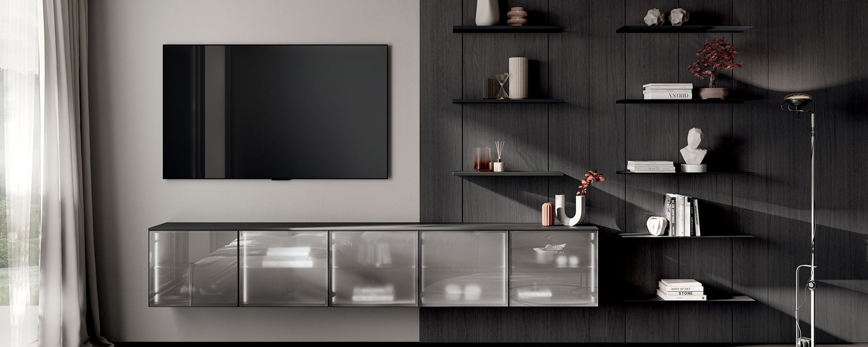 Materiali e finiture: puoi scegliere laccati opachi o lucidi dall’aspetto vellutato, nobilitati decorativi effetto legno, pietra o metallo per donare profondità tattile alla parete. Le gole e i profili possono creare contrasti cromatici discreti o soluzioni tono su tono. Gli schienali attrezzati, le vetrine e le mensole permettono di alternare parti contenitive chiuse a vani a giorno, così esponi libri e oggetti e nascondi cavi e accessori.